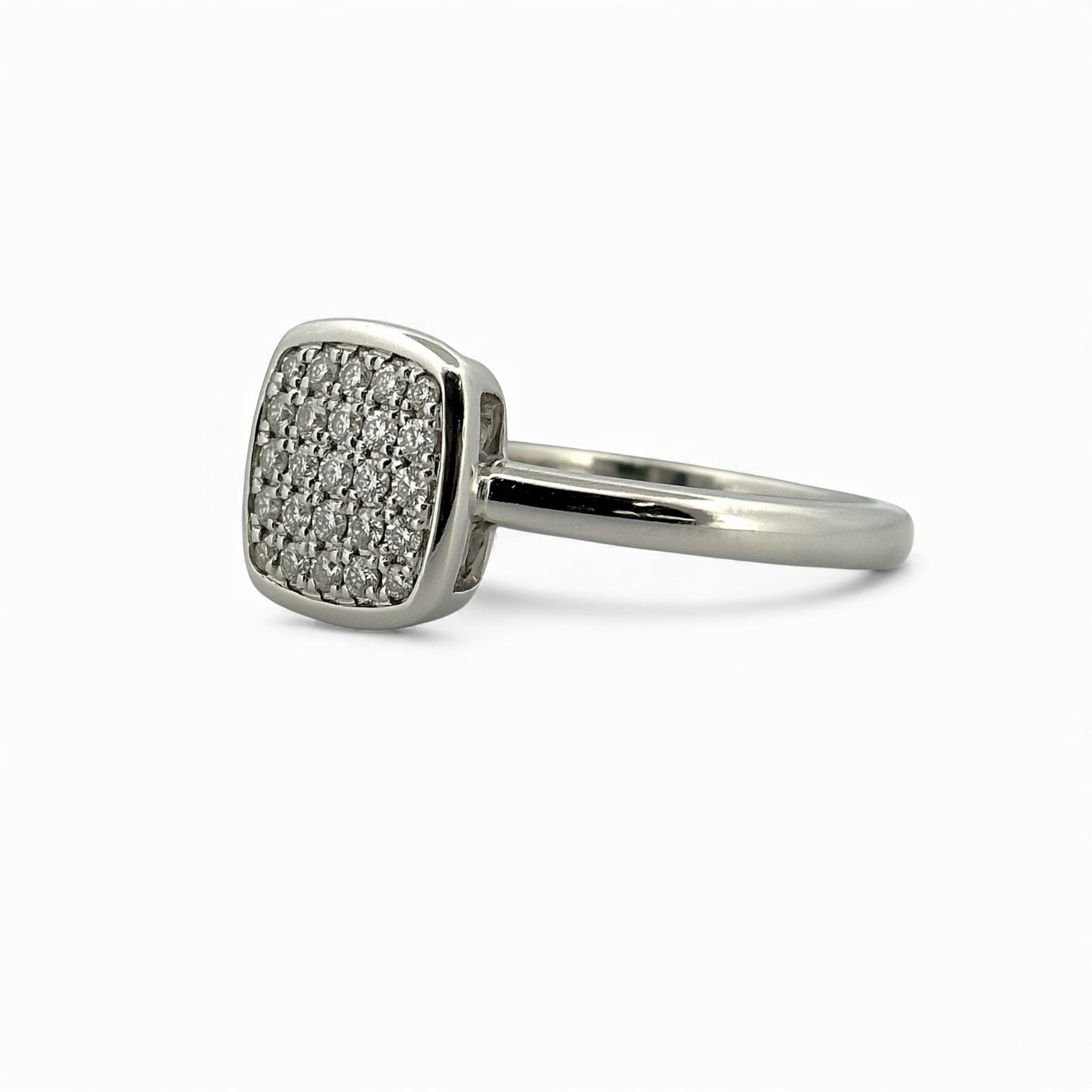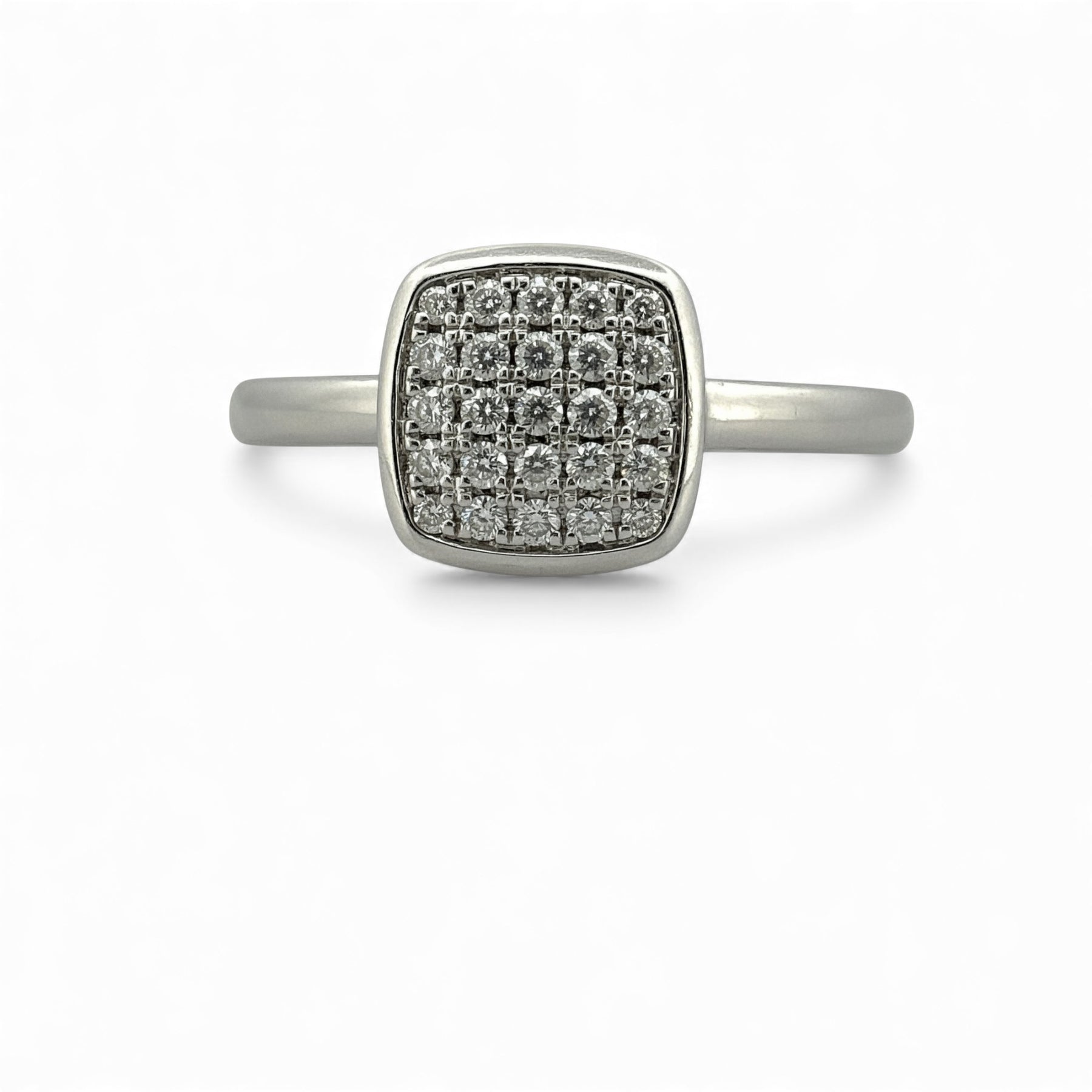 18ct White Gold cushion ring with 25 round diamonds in a Pave setting with a total weight of 0.21ct.