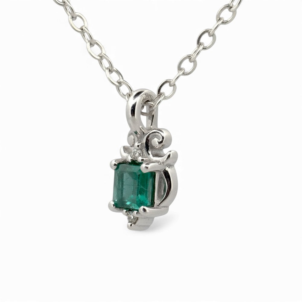 10ct White Gold Pendant with a 0.33ct natural emerald accompanied by 2 round diamonds with a of total weight 0.02ct.