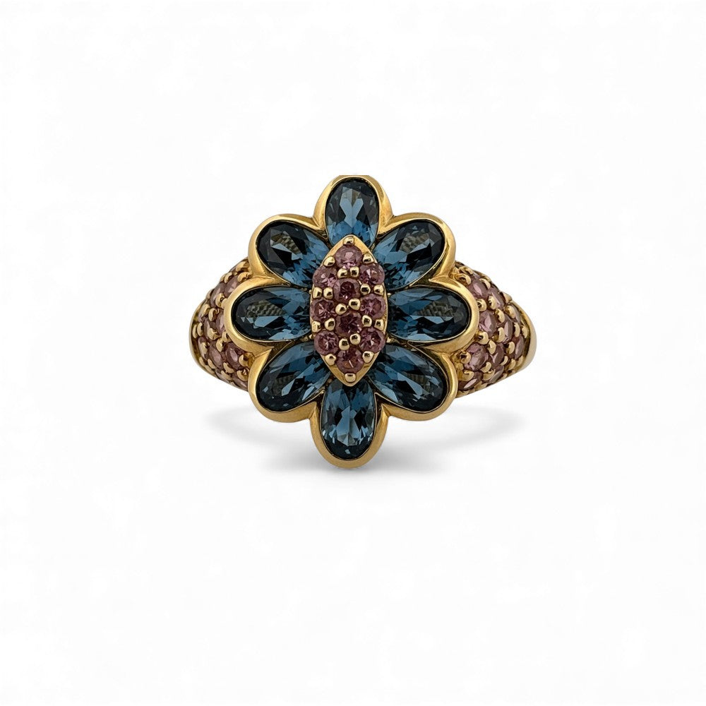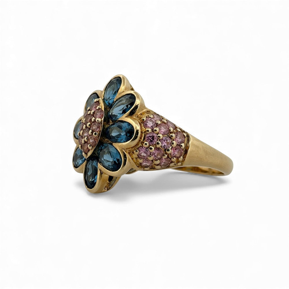 9ct Yellow Gold ring set with 8 London blue topaz and 3.03ct pink tourmaline.